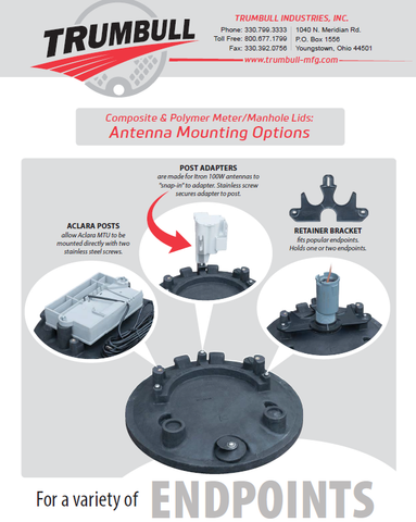 In addition to Trumbull meter ox lids with custom counter bores, a Solid lid can be used with the under lid AMR and AMI brackets. These backets fit Trumbull solid Polymer and composite meter box cover lids to hold various AMR and AMI radio transmitters and devices under the polymer cover. Polymer covers are radio transparent. When mounted under lid, they are safe from mowers, trip hazards, snow blades, and curious residents wondering what the device is when you use a counter-bore hole lid.