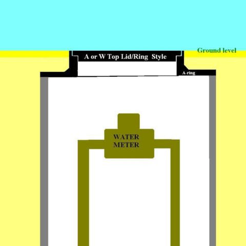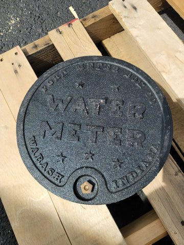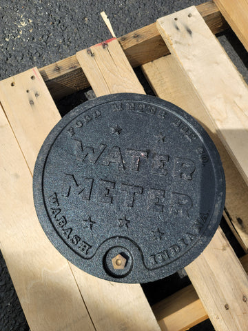 Ford Meter Box WA3L solid cast iron water meter box top lid. Fits Type A and Type W Wabash frames. With standard brass pentagon locking bolt and cast iron worm gear. Top marked "Water Meter". With brass pentagon lock nut and cast iron worm gear.